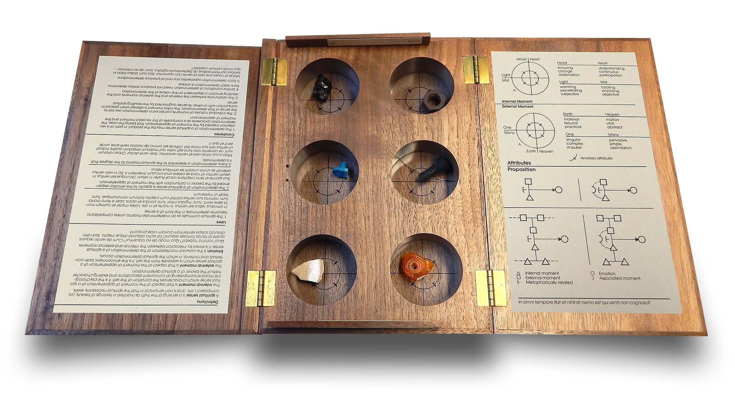 INSPIRED BY Isaac Newton’s "Principia Mathematica," this device establishes principles for the spiritual realm. Using the chance position of found objects, the provided propositions, when applied according to the piece’s laws and corollaries, can predict with accuracy the movement and nature of the emotions. The Latin phrases that accompany the laws and other texts are translations of the laws and corollaries that I wrote (Newton’s original was in written in Latin).