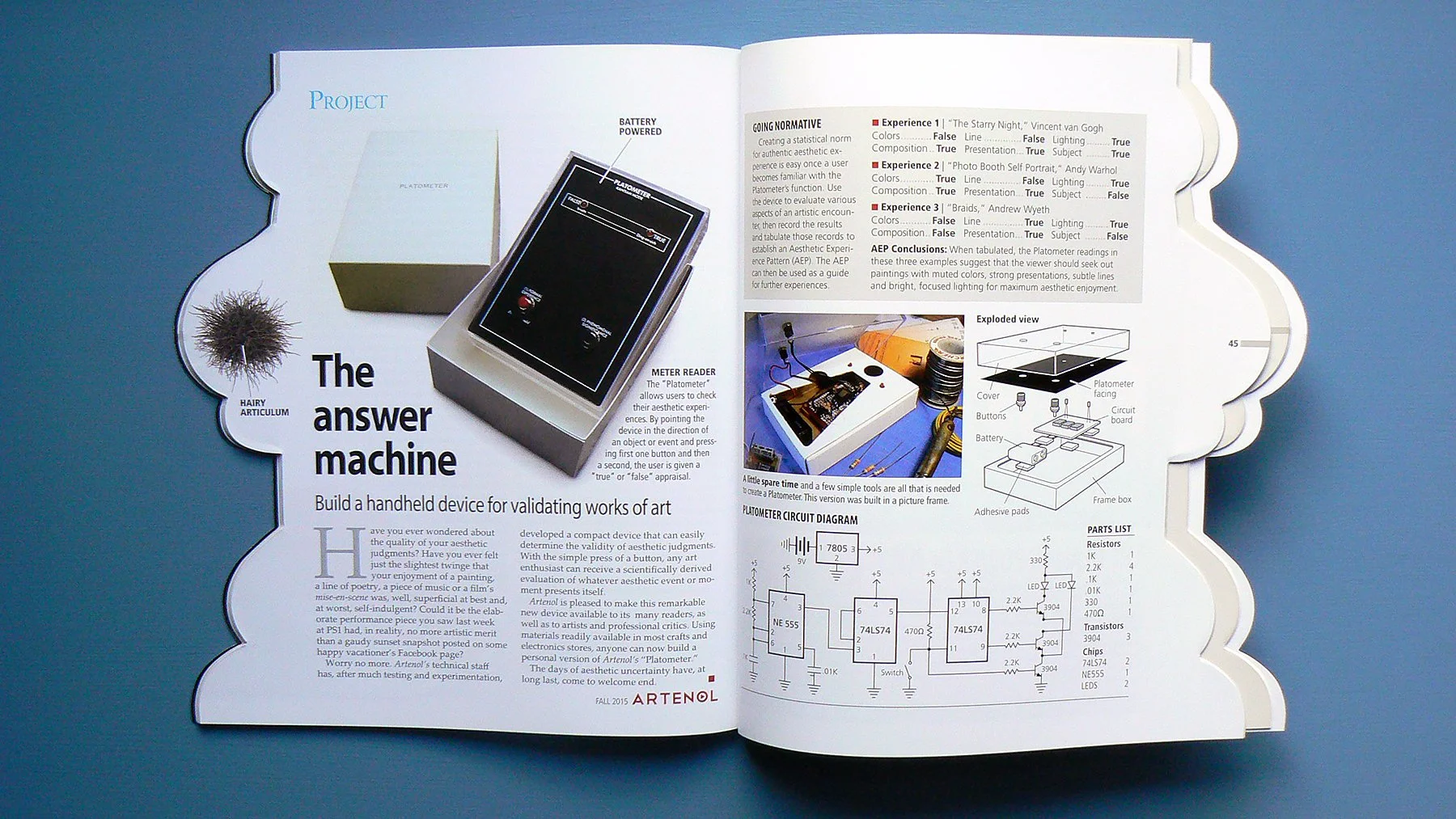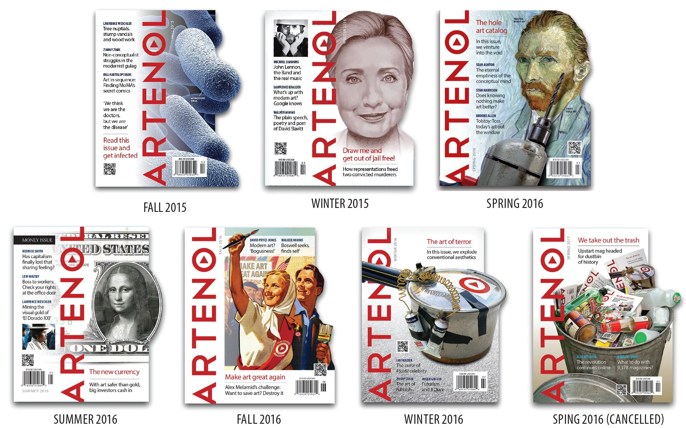 A COLLABORATIVE PROJECT with Alex Melamid, Artenol was a quarterly publication intended to be a “cure for what ails art.” Taking its name from the analgesic Tylenol and published by Healing Arts Ministry, the magazine featured articles by authors such as Francine Prose, Ian Frazier, Michael Ratner, Gary Indiana, Lawrence Weschler, Rowling Dord and Zinovy Zinik. The New York Times called Artenol “a cross between the New Republic and Mad Magazine,” and both the Library Journal and Stack called it one of the best new magazines of 2015. With its unusual die-cut shape, the magazine easily stood out from other art periodicals. Its satirical, irreverent attitude also set it apart. Though the magazine folded after several years of publication, I was fortunate to be Artenol’s art director, editor, production manager and occasional contributor. Articles by Rowling Dord were written by me. (“Dord” is the only non-word to ever appear in Oxford English Dictionary. It was a typo on what was supposed to read as “D. or d.,” an abbreviation for a chemical term. It seemed a perfect surname for a writer who didn’t exist.)